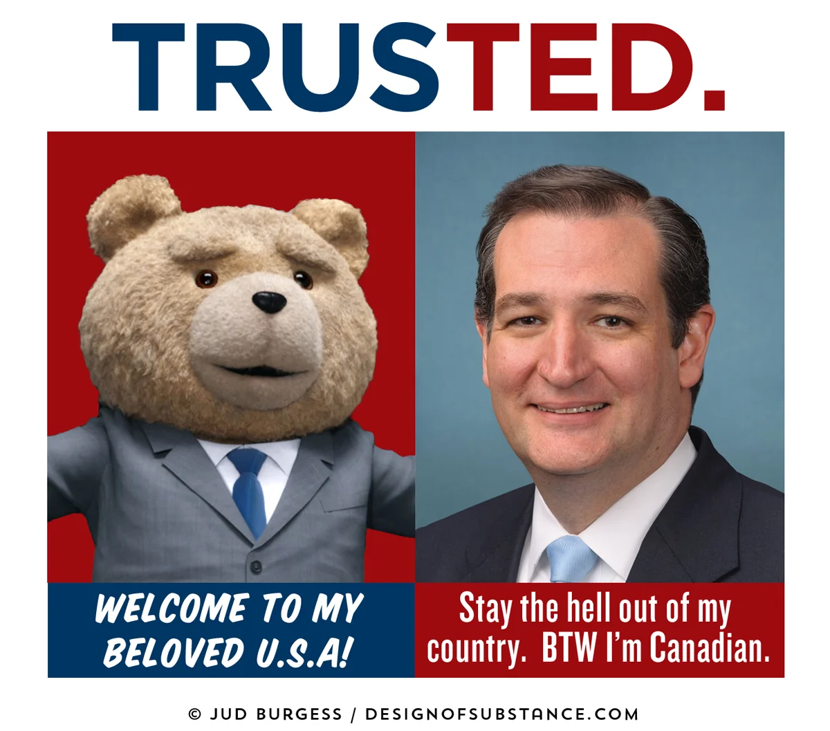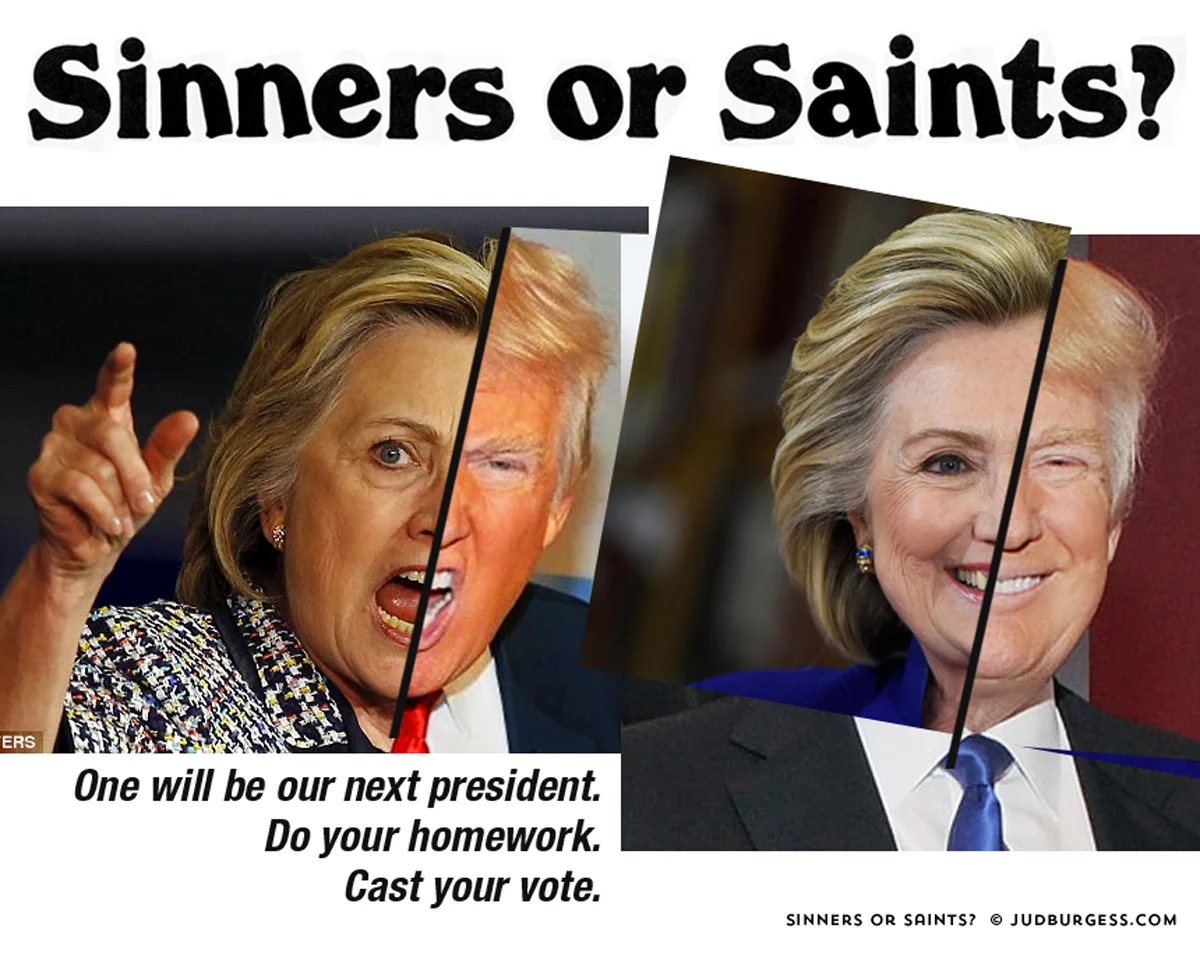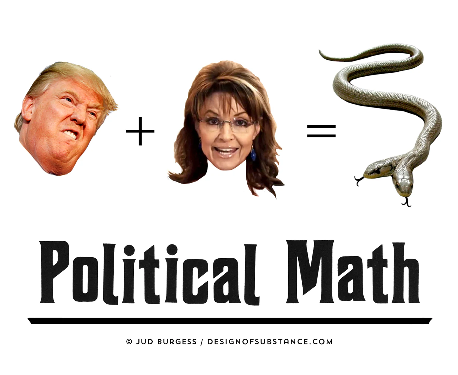A visual and communications challenge where the headline changes only by one letter but the entire political message is different. This first in the series was done right after Sarah Palin endorsed Donald Trump. January © Jud Burgess