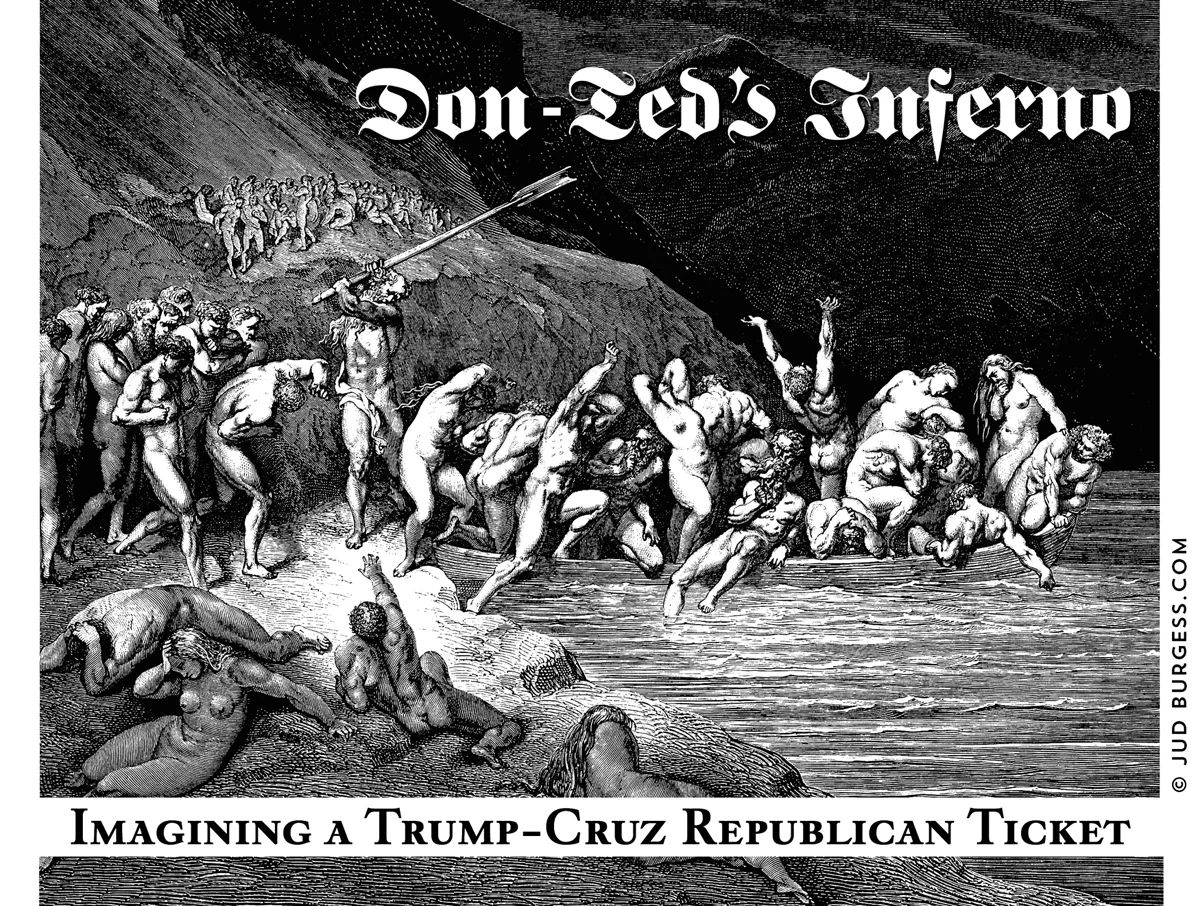 A visual play off of Dante’s Inferno. Donald Trump and Ted Cruz are not exactly friendly to immigrants. I’m using an actual Dore etching of Dante’s Inferno to illustrate that. January 2016. © Jud Burgess