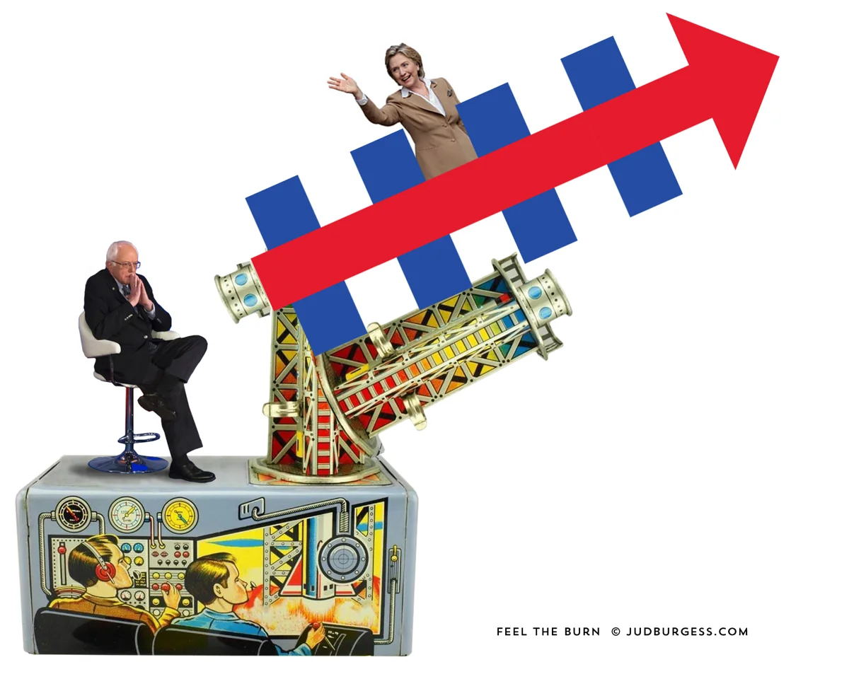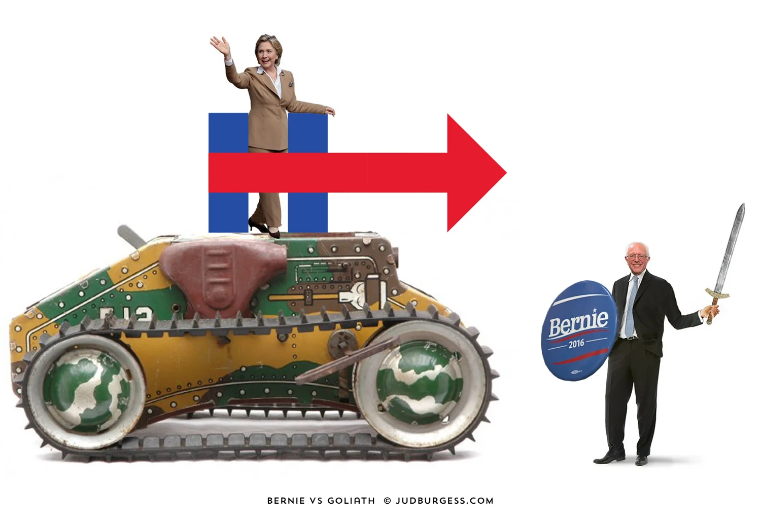 Second in the HILLARY VS. BERNIE series reflects the near impossibility of Sanders beating Hillary in light of her political juggernaut machine. Bernie has his shield, sword, and the backing of one of the largest grass roots movements not seen in recent times.