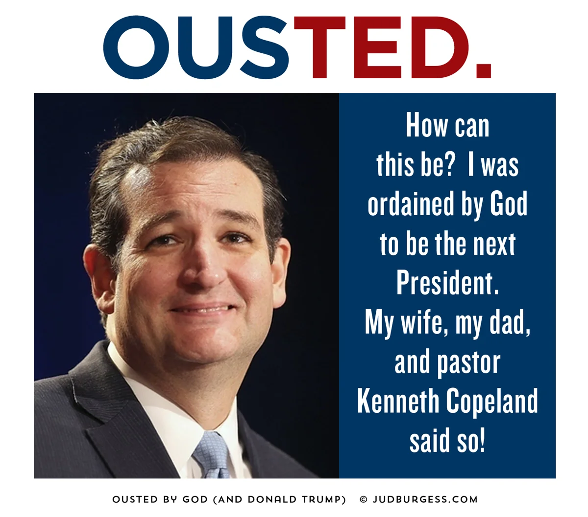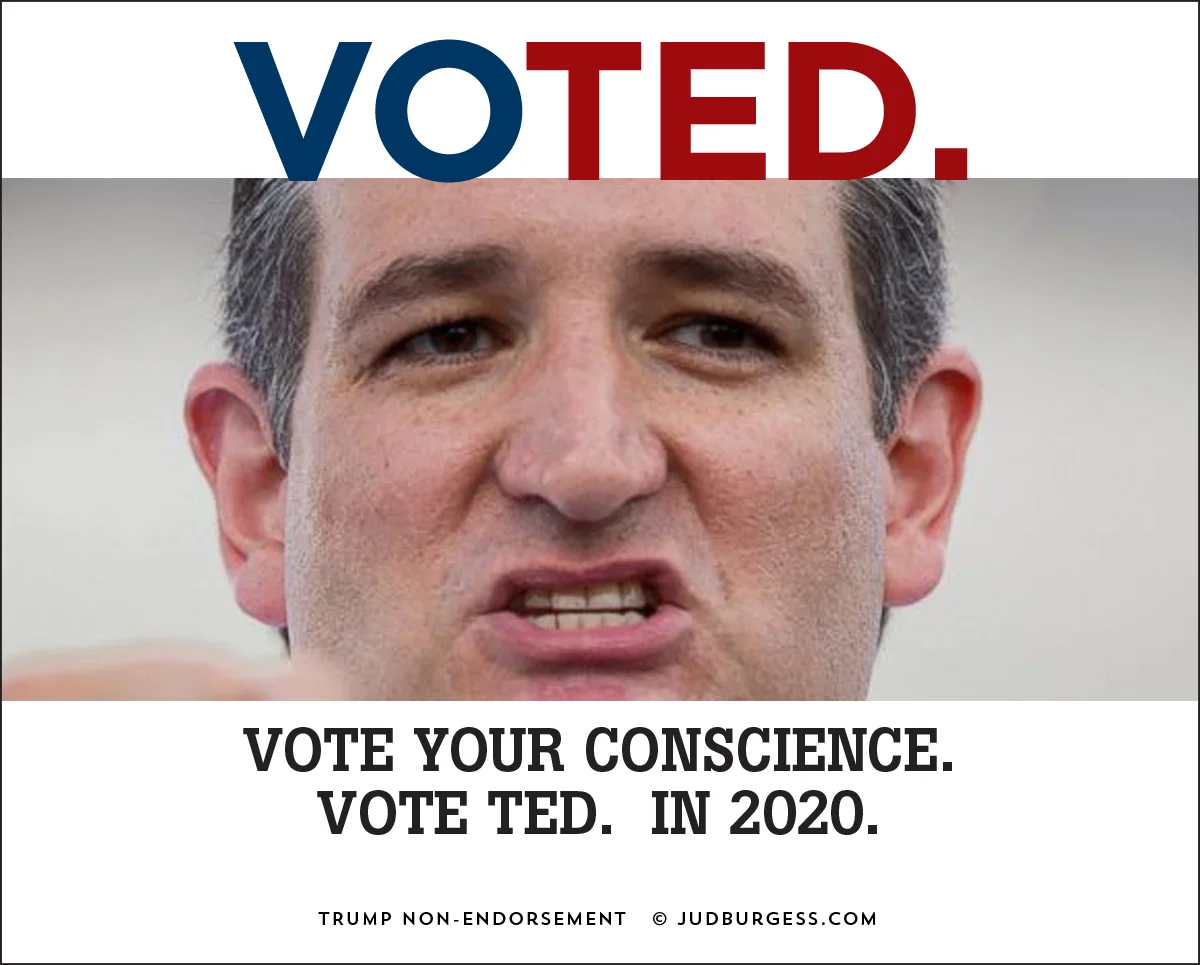 Remember the Donald Trump / Ted Cruz debacle? Trump calling Ted's wife ugly, tying his dad into the Kennedy assassination, Lying Ted...Ted remembers and won't soon forget. Which is why he DID NOT endorse Trump during Trump's coronation as the Republican nominee. In fact, he basically endorsed himself and set himself up for another run at POTUS in 2020, assuming America has not completely become reprobate thereby ushering in the Great Apocalypse under Trump or Hillary. Ted believes he has been ordained by GOD (as does every other Republican candidate) to save America from ruin and he will not let a pissant like Trump get in his way, even if he has to wait 4 more years. Never underestimate the patience of a delusional man. © Jud Burgess, July 2016