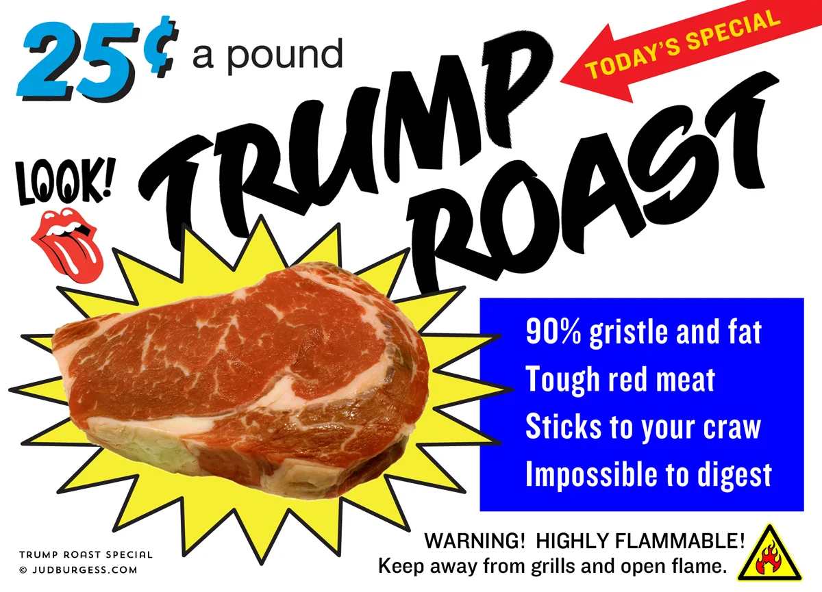 A cheap grocery store ad special for an inedible steak as a metaphor for Donald Trump. © Jud Burgess, June 2016