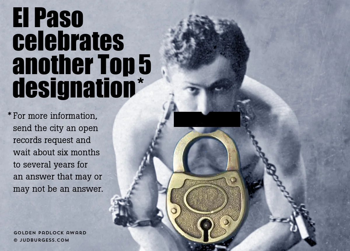 AIf you’re intrigued about El Paso’s latest Top 5 honor and wondering what this is in reference to, read the the following El Paso Times article: City nominated for it’s secretive efforts. With apologies to Harry Houdini. © Jud Burgess, July 2016