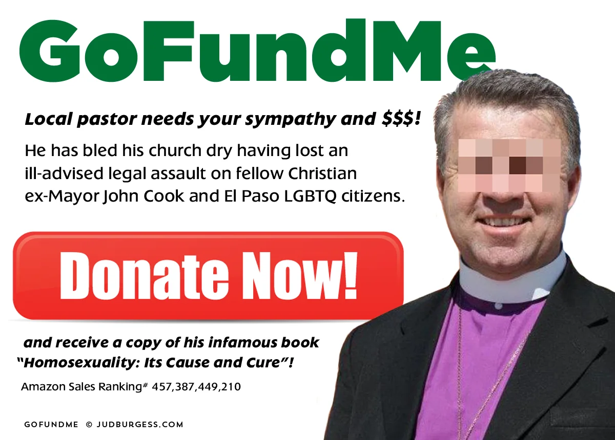 Brown is trying to spin his catastrophic decisions to punish the LGBTQ community and subsequent loss of his legal assaults as an “El Paso vs. Word of Life Church”. An assault of the “free speech” of churches even if it was his church that broke the law by ignoring the Separation of Church and State rules.