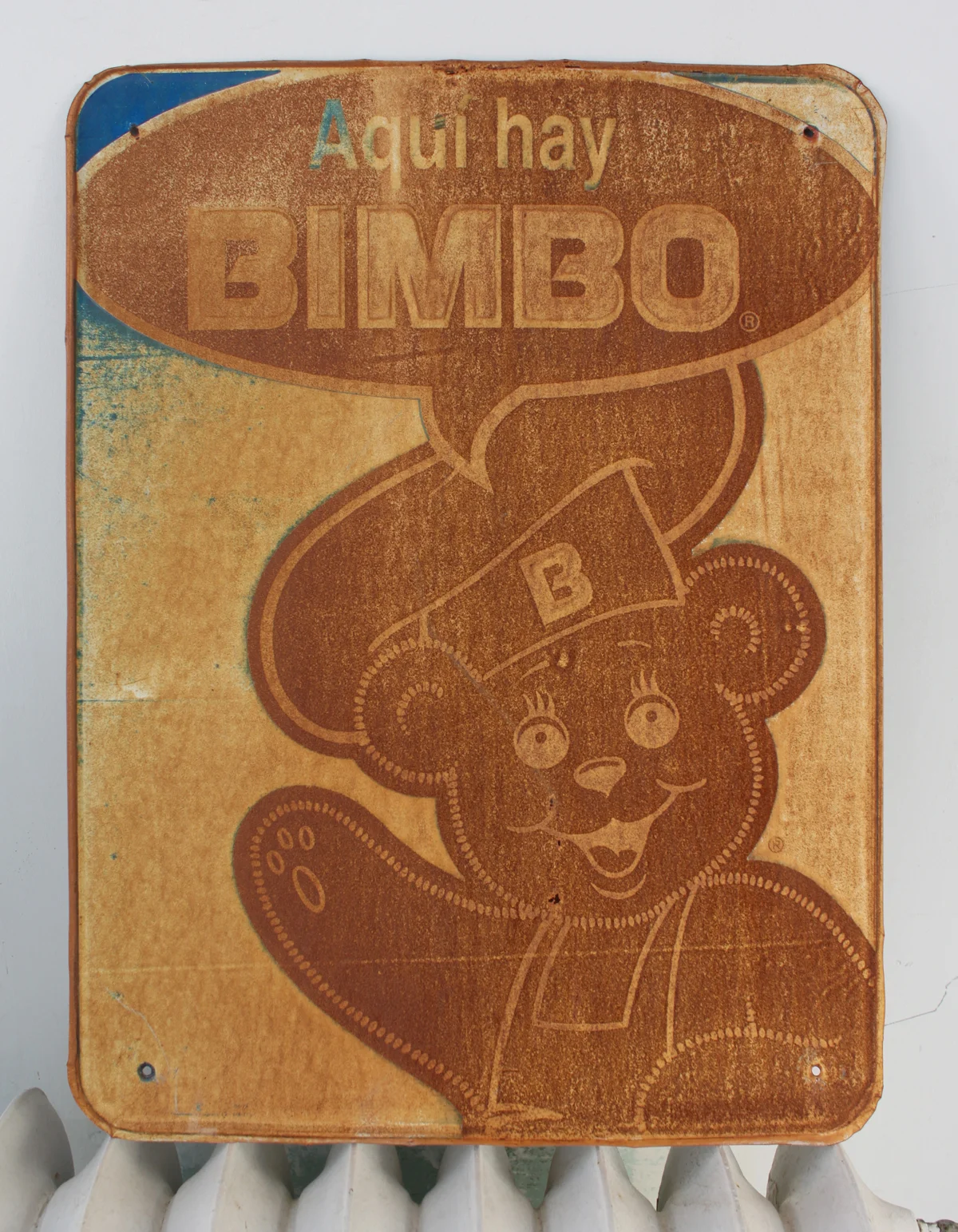 What makes this sign in my collection so fun is the talk bubble with the word BIMBO which is actually the name of a Mexican loaf of bread but we all know what it means in English. Translated it says “Get your Bimbo here.” I also like the way that the image has become a negative of itself as the sun burned out the color and the rust took over. The touch of blue, the white space, the line work all makes for a nicely done design. Found it on the side of an old Mexican neighborhood corner store not far from the mountainside near Scenic Drive. I bought it from the store clerk who first asked the BIMBO salespeople if he could get a new sign because the old sign had seen better days. He got his new sign and I got the priceless one.