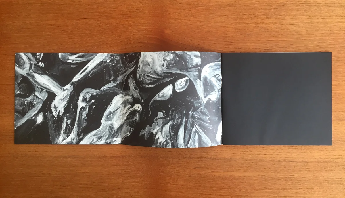 Front cover folds out into what appears to be an abstract pattern. It is a close-up detail of one of Hendrick’s paintings. It was my intent to have the viewer study it closely enough to realize they were looking at bodies. With a careful look, you'll find a torso and legs, then the realization sets in.